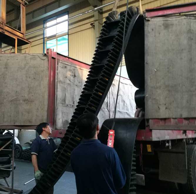 大傾角波狀擋邊帶:擋邊起防止物料測滑撒落的作用。為便于繞過滾筒,檔邊設計成波紋狀;橫隔板的作用是承托物料,為了實現大傾角輸送,采用T型TC型。檔邊和橫隔板是用二次硫化的方法與基帶連接的,具有很高的連接強度